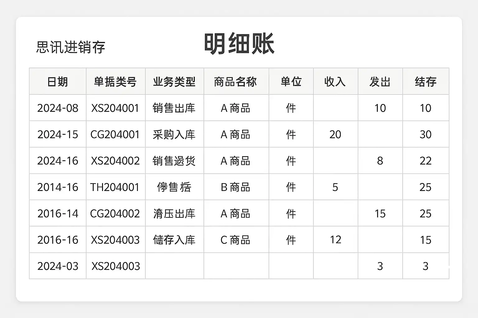 | 库存余额表 | 各品类/批次当前数量及金额 |