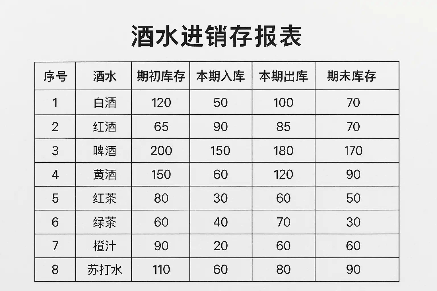 一个标准且高效的酒水进销存报表应包含如下结构: