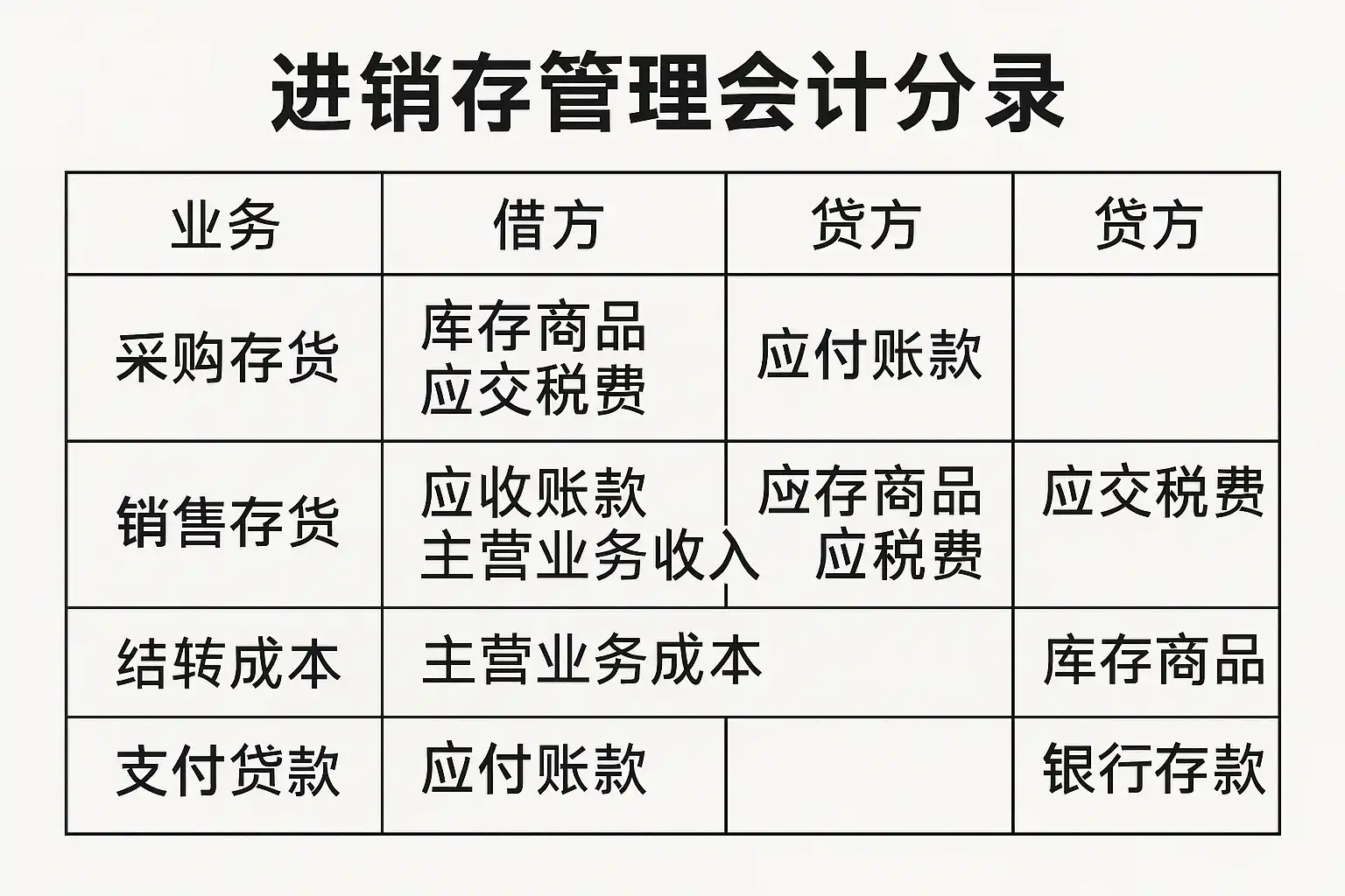 | 采购 | 库存商品, 应付账款 | 借:库存商品 贷:应付账款 |