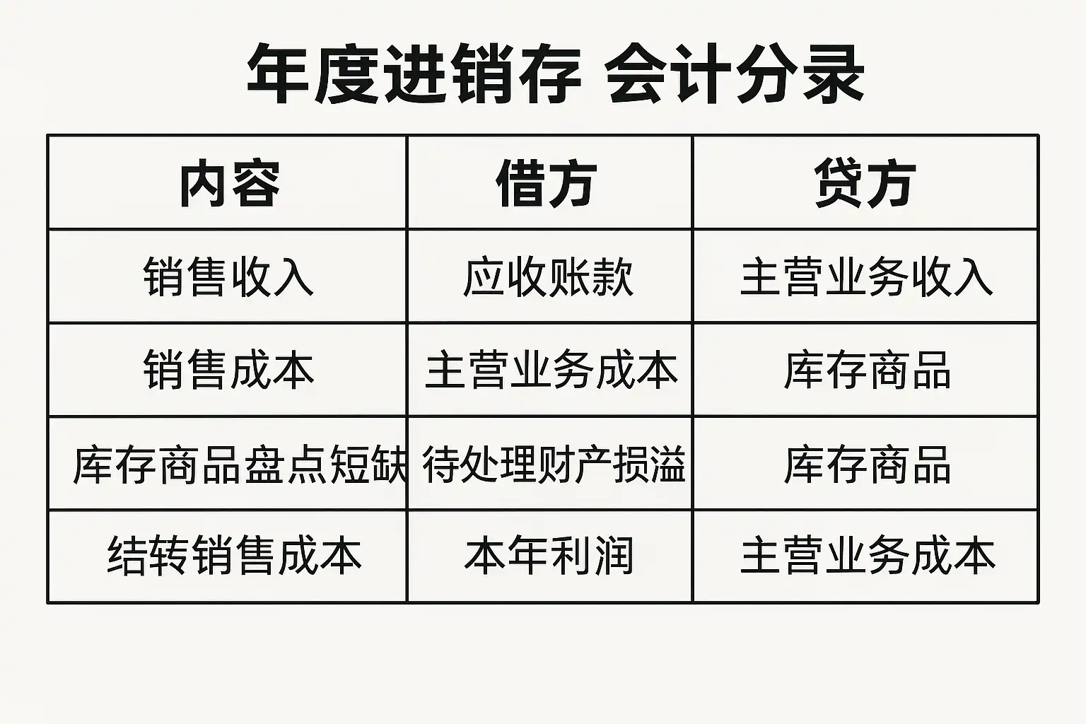 - 盘点调整:根据盘点结果,若实物大于账面,借记“库存商品”,贷记“待处理财产损溢”;反之则相反。