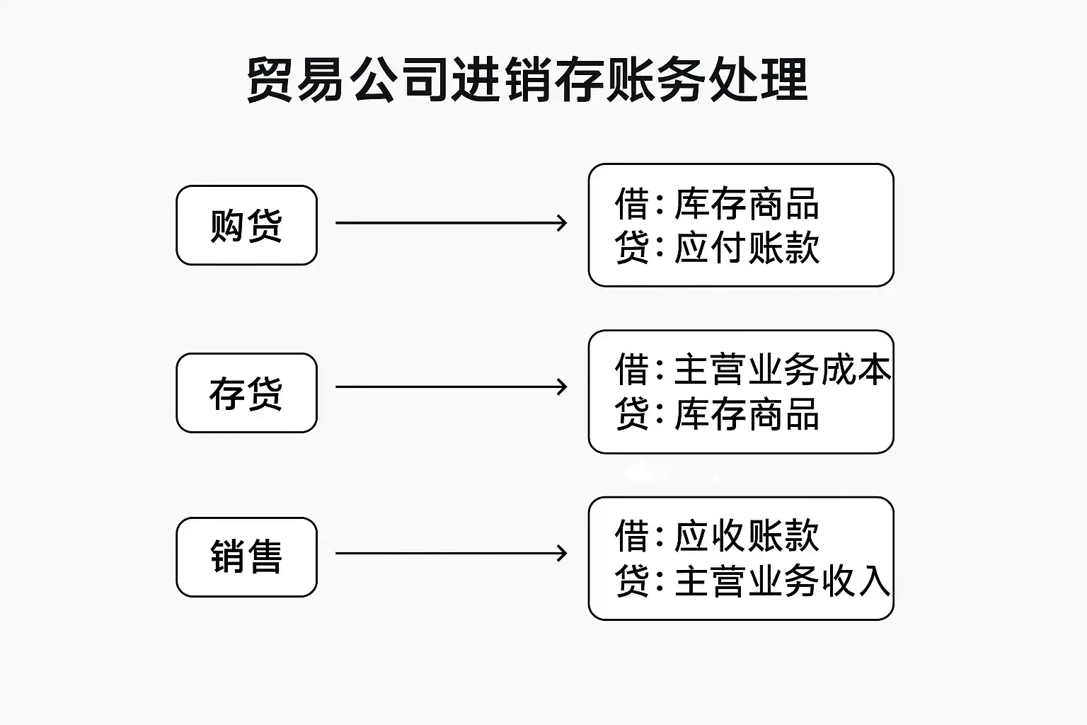 | 销售 | 卖出商品 | 借:应收账款/银行存款 等 | 应收账款,主营业务收入 |