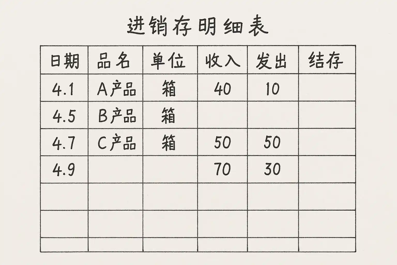 - 每当发生一次商品入库或出库业务,应立即在当日对应商品行补充新一条记录,而不是事后统一填补。