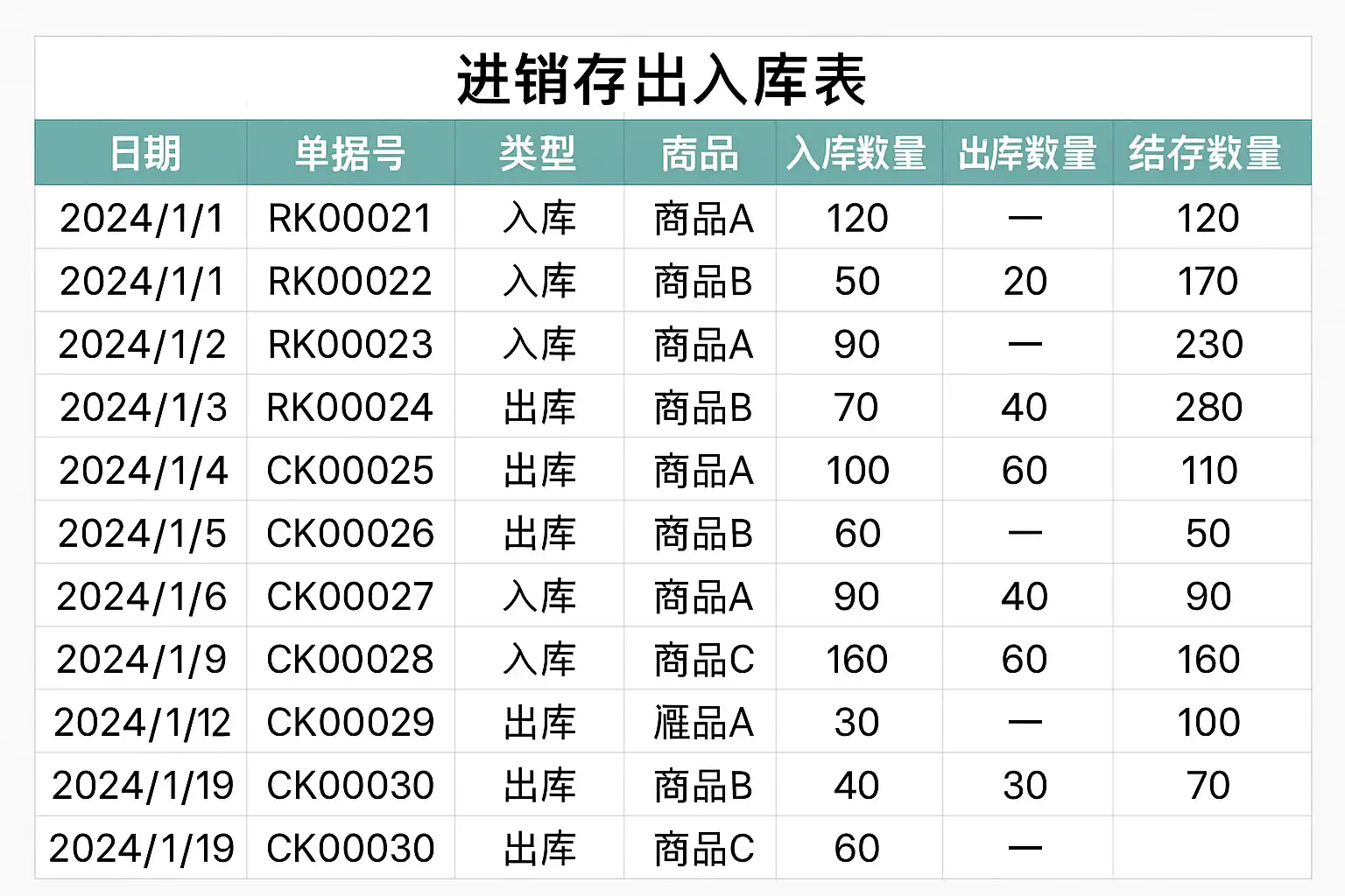 | 日期 | 单据类型 | 商品名称 | 编码 | 入数量 | 出数量 | 库存结余 ||------------|-------------|---------------|-------------|-------------|-------------|2024/05/01 入库 A物料 A001 100 — 1002024/05/03 出库 A物料 A001 — 40 60该示意只要采集到对应动作,即可按日/月维度生成完整流水,并支持一键导出、多维透视分析。