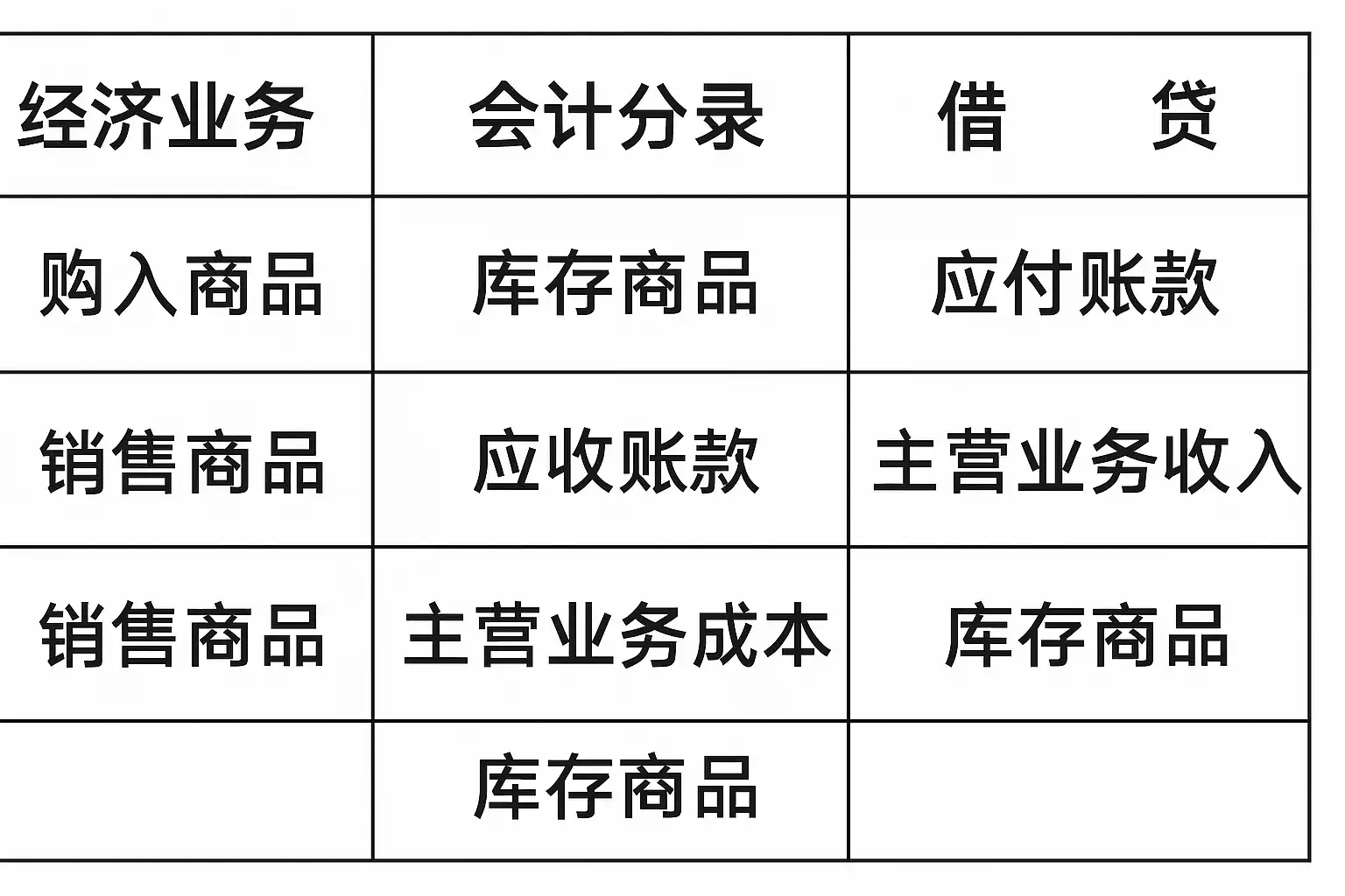 | 采购入库 | 采购发票/入库单 | 库存商品 | 应付账款 | 按采购价记账 |