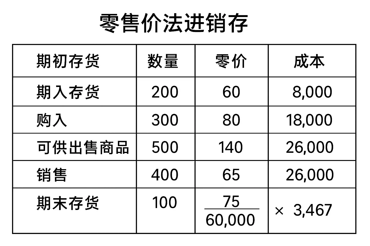 零售价法通过以商品的销售价格(零售价)为基础进行库存核算,步骤包括: