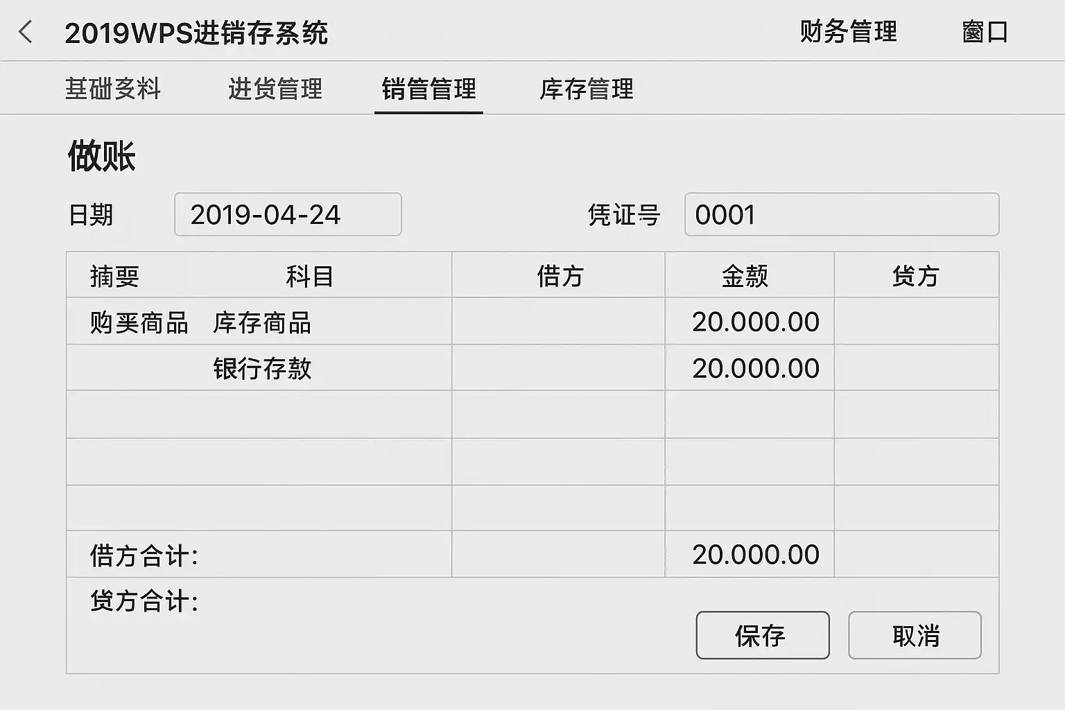 2019WPS进销存系统内置自动化做账模块,支持凭证自动生成和智能记账。关键功能包括: