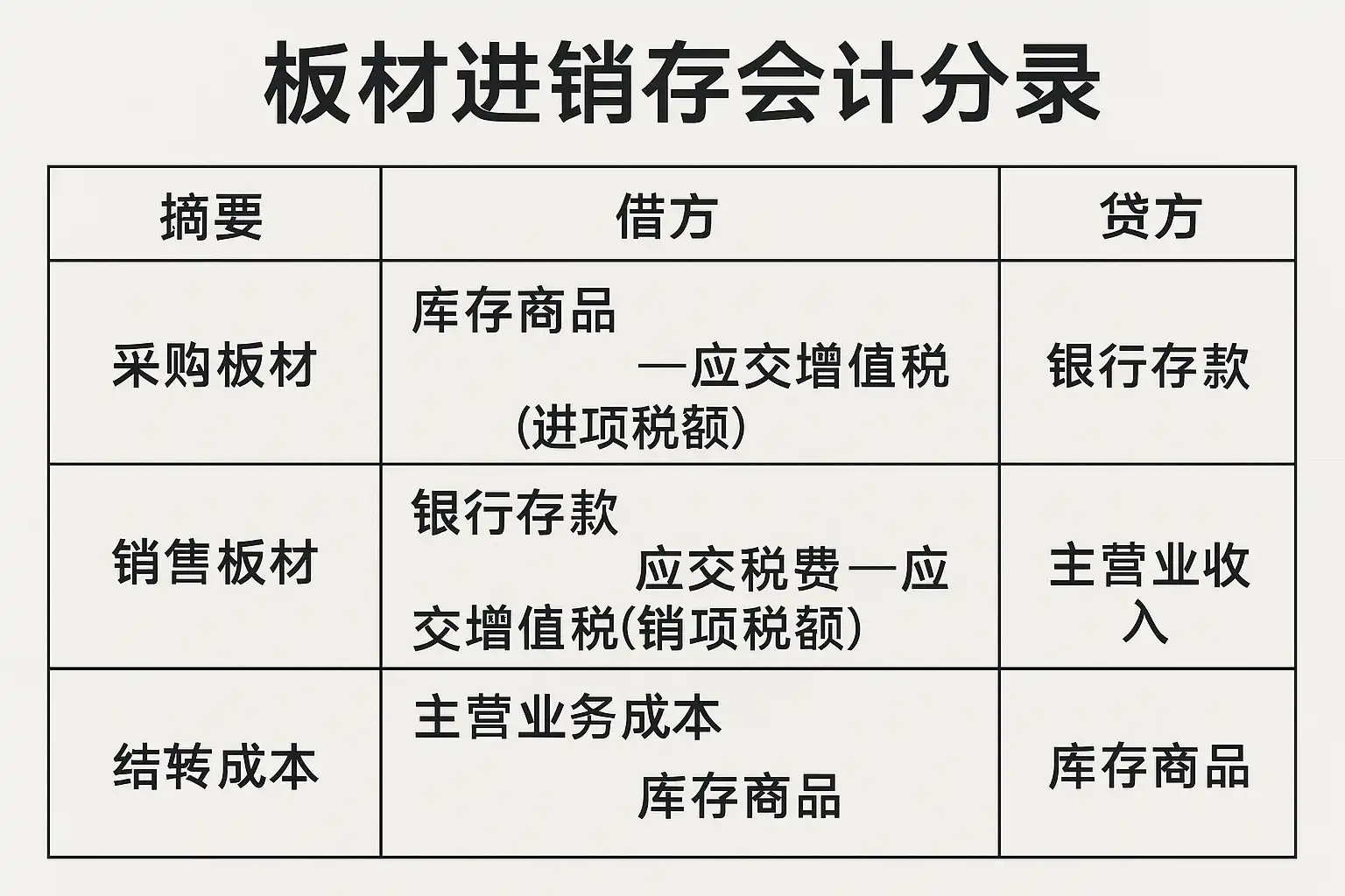| 板材采购 | 原材料/库存商品 | 应付账款 | 根据发票入库金额确认 |