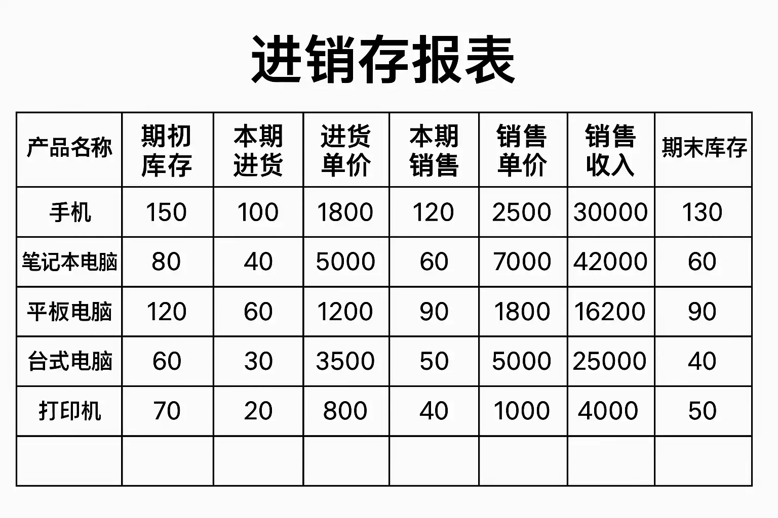 | 商品编码 | 商品名称 | 单位 | 期初库存 | 本期采购数 | 本期销售数 | 期末库存 |