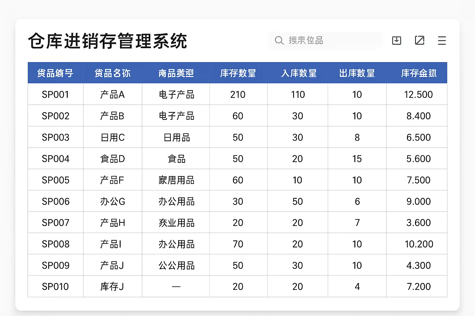 | 报表输出 | 库存报表、流水明细等展示 | 透视表/筛选排序 |