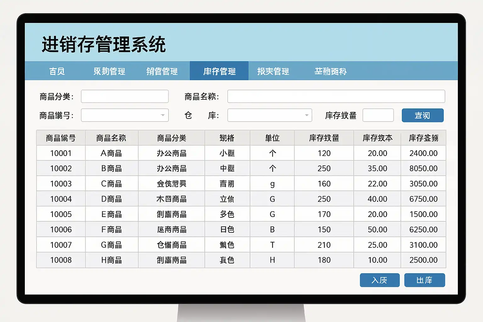 电脑进销存管理系统通常包括采购管理、库存管理、销售管理和财务结算四大核心模块。设计时采用模块化架构,确保每个模块独立且协同工作。例如: