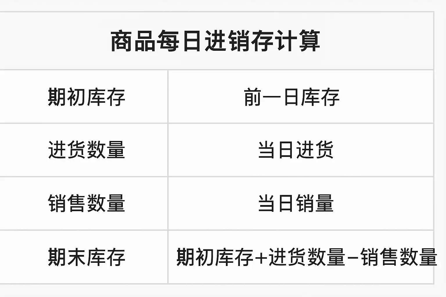 | 5. 得出期末库存 | 用公式计算:期末=期初+采购-销售±退货 | 明确一天结束后的真实库存 |