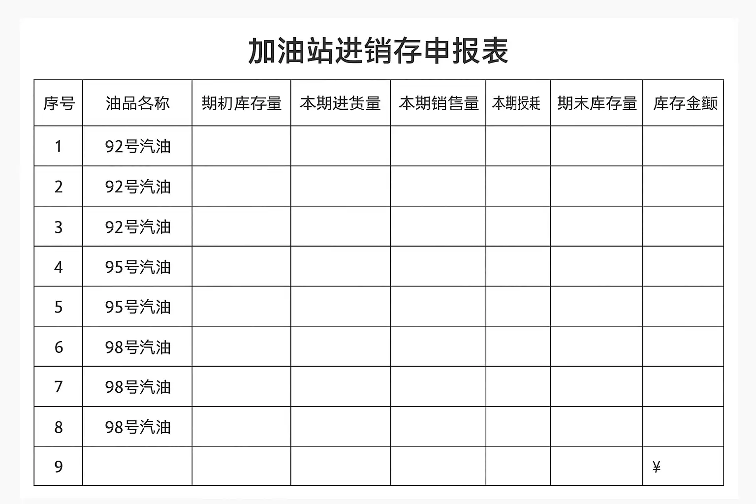 常见的加油站进销存申报表一般包含如下结构与字段:
