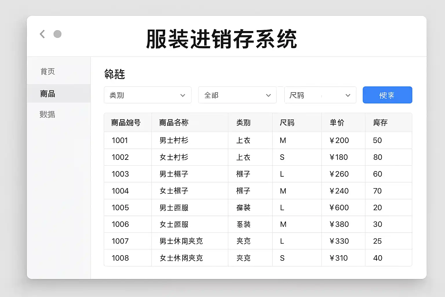 | 商品信息 | 商品编号、名称、品牌、尺码、颜色、分类 |