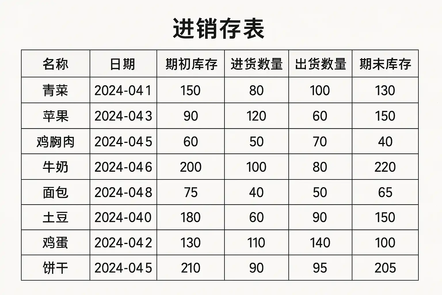 食品类的进销存表格应该包含哪些关键数据?