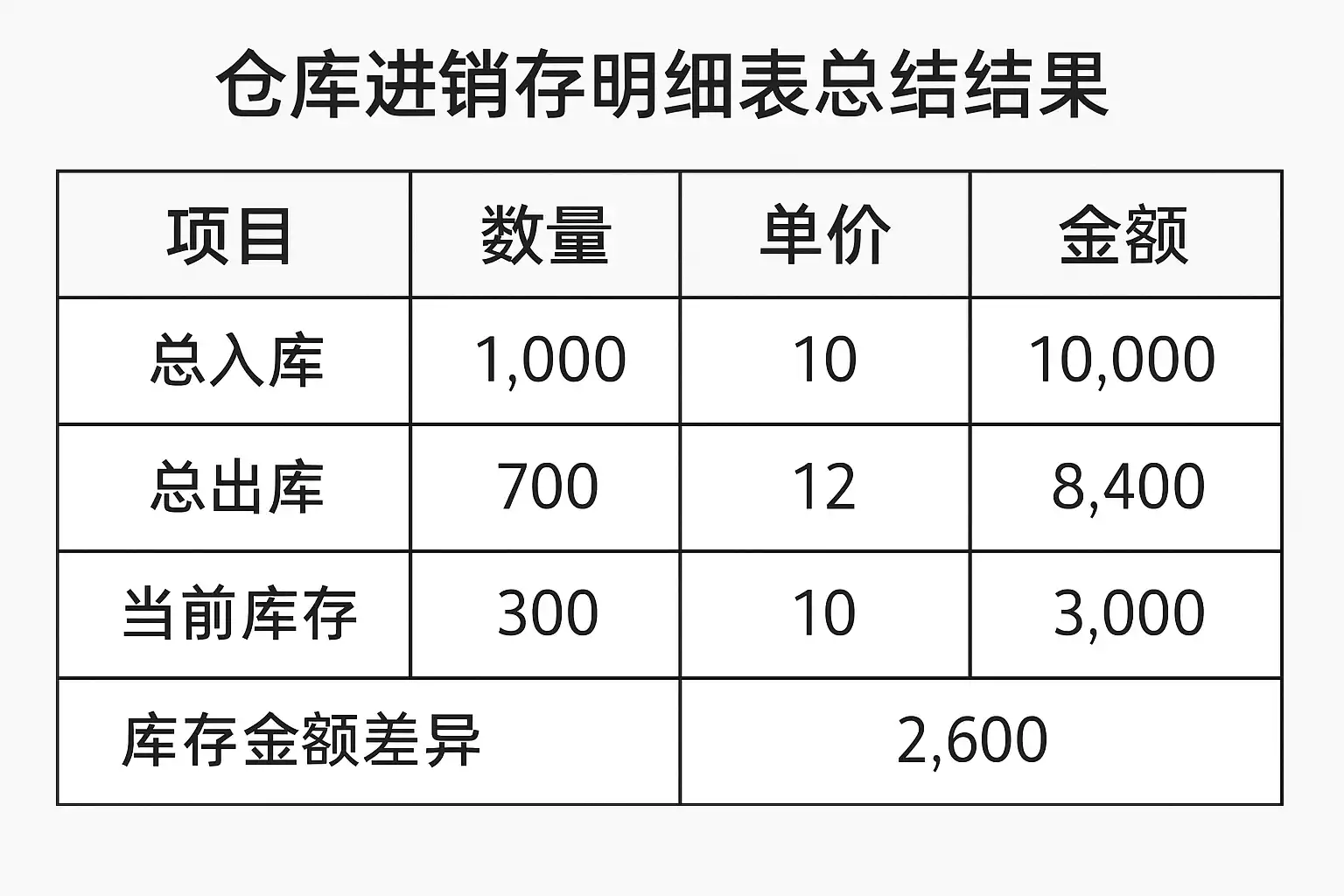 | 差异分析 | 比较期初+入库–出库=期末库存公式,有差异需溯源查找原因 |