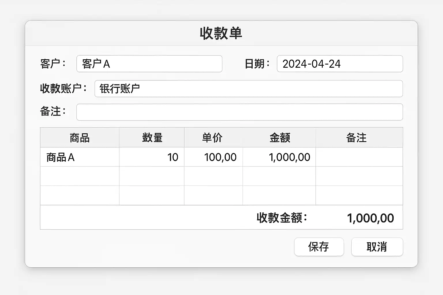 - 定义: 收款单是企业在销售商品或服务后,收到客户货款时所生成的会计凭证。