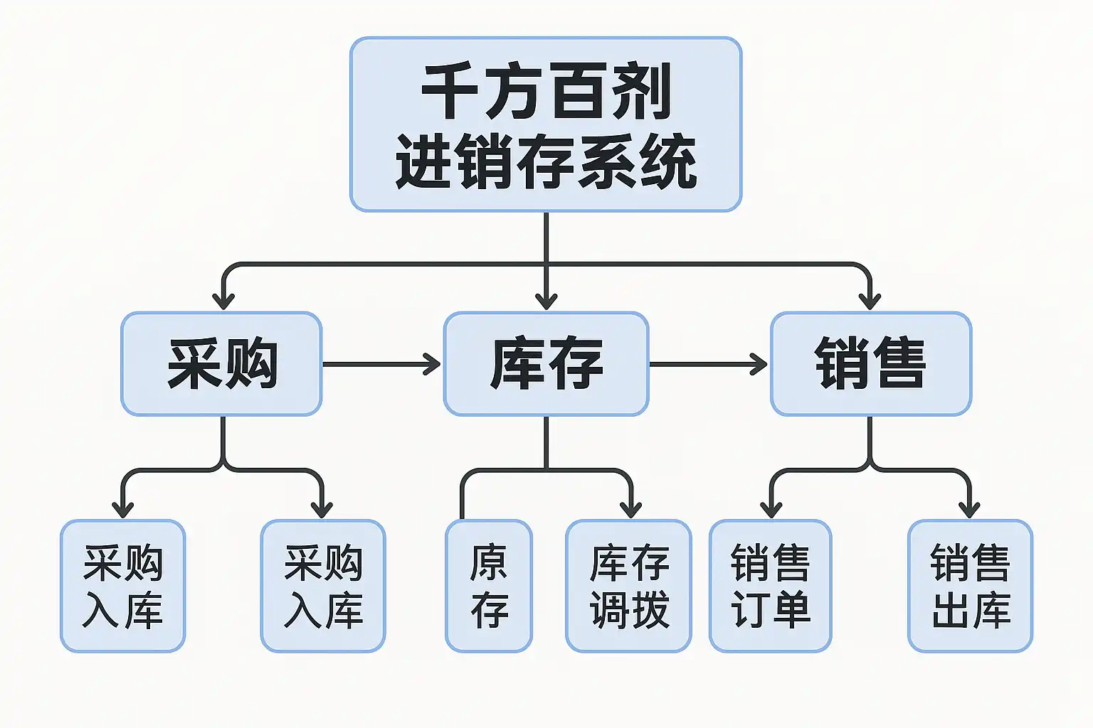 我在使用千方百剂系统时,想知道它是如何实现进销存管理的。具体有哪些模块支持采购、库存和销售的流程?我希望了解系统功能的整体架构。