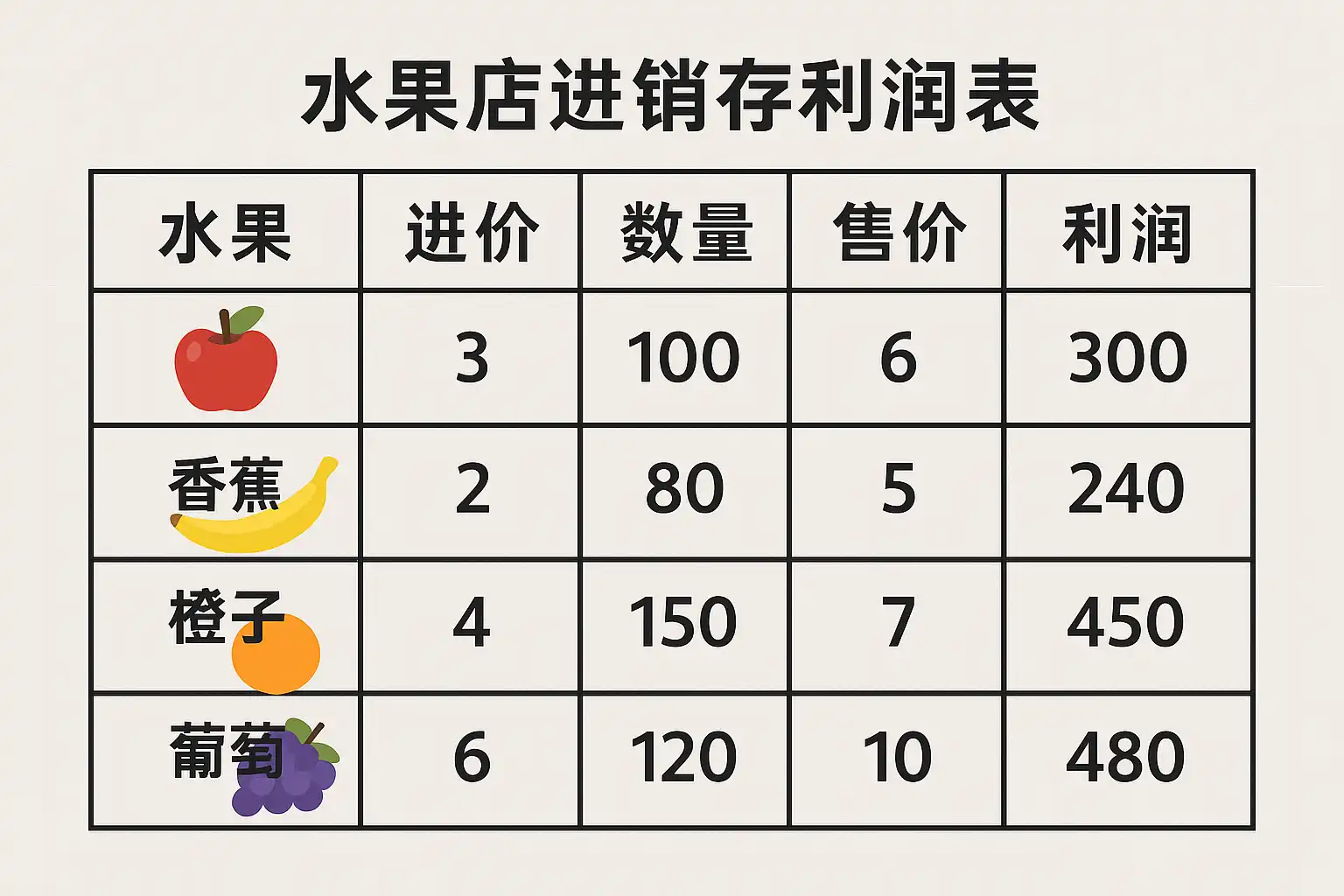 | 日期 | 商品 | 今日购入 | 今日售出 | 剩余 | 总购货款 | 总销售款 | 粗略毛利| |------|------|----------|----------|------|----------|----------|---------| |6月10日|香蕉|20斤 |15斤 |5斤 |100元 |150元 |50元 |
