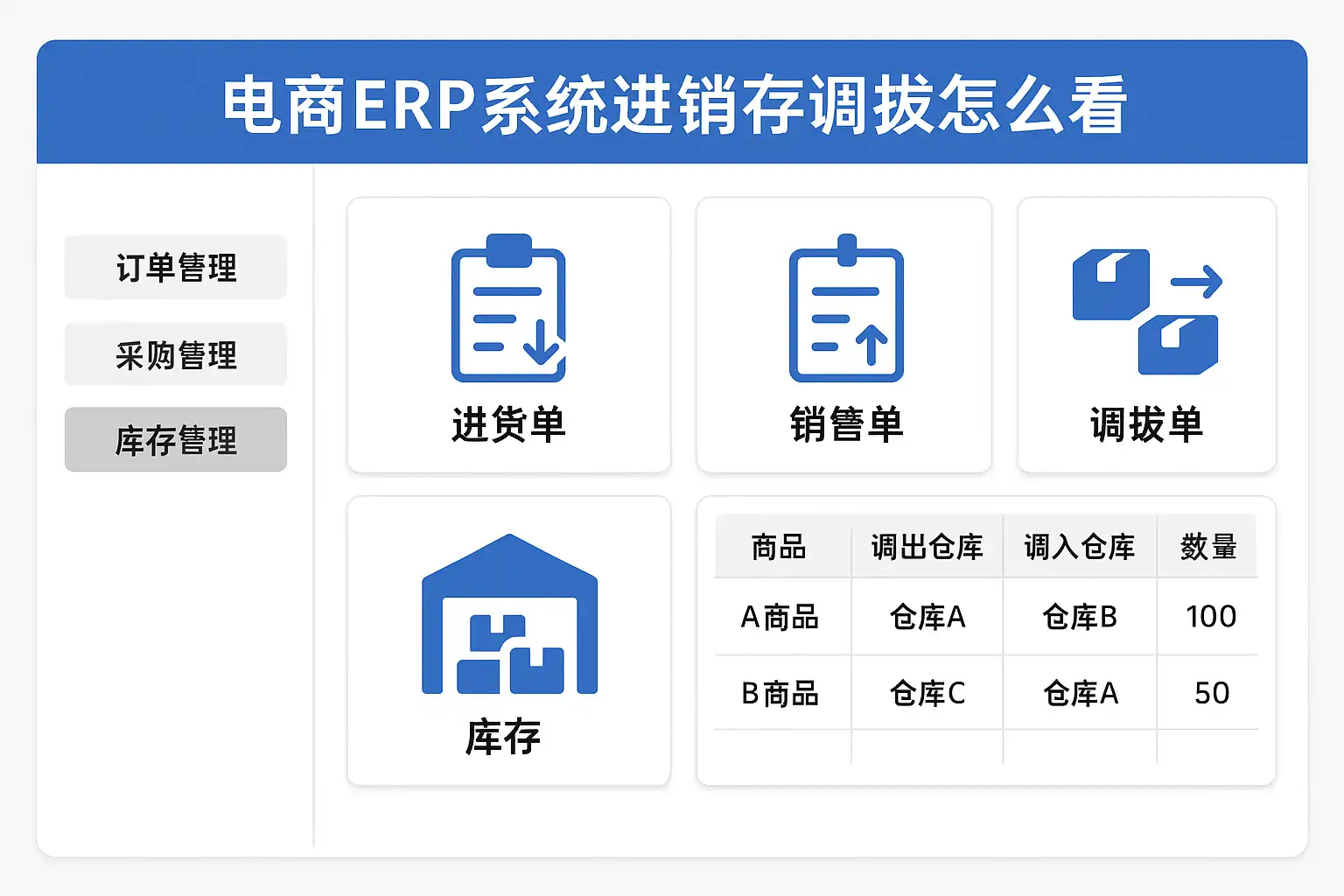 进销存系统是企业管理采购(进)、销售(销)、库存(存)三个核心环节的信息化工具。在电商行业,由于商品SKU众多、仓储点分布广泛,“调拨”成为连接各仓库的重要环节。理解以下概念有助于把握如何在ERP中查看并操作这些环节: