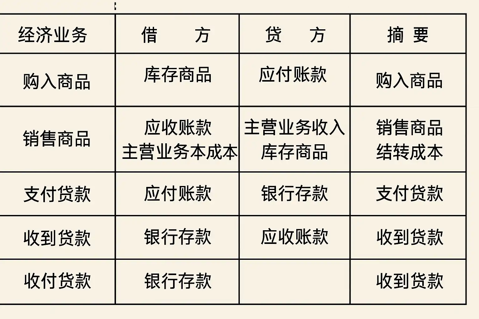 | 采购入库 | 购买原材料/商品 | 库存商品、应付账款等 | 借:库存商品 贷:应付账款 |