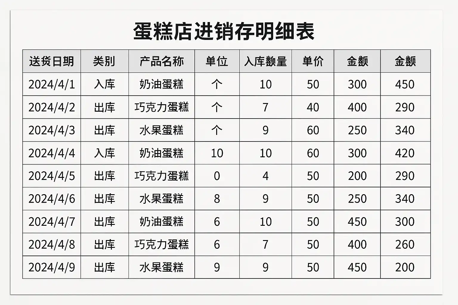 一、蛋糕店进销存明细表的基本结构