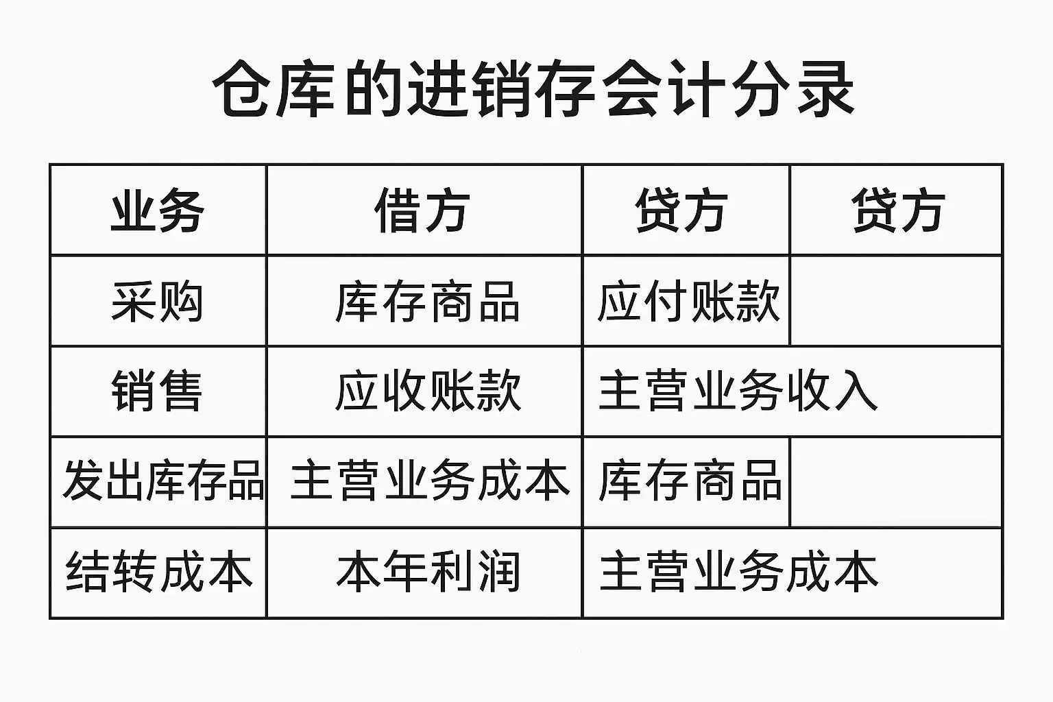 | 操作类型 | 会计分录示例 | 说明 || --- | --- | --- || 入库 | 借:库存商品 / 贷:应付账款 | 采购货物入仓 || 出库 | 借:主营业务成本 / 贷:库存商品 | 销售出货降低库存 || 盘盈 | 借:库存商品 / 贷:营业外收入 | 实际库存多于账面 || 盘亏 | 借:营业外支出 / 贷:库存商品 | 实际库存少于账面 |
