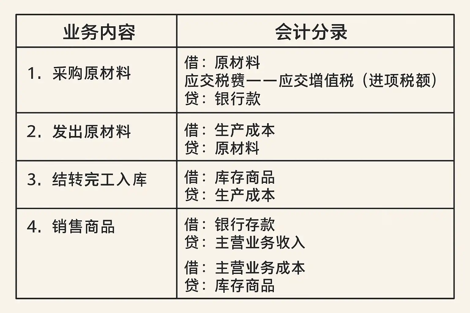 - 原材料采购:借记“原材料”科目,贷记“应付账款”或“银行存款”。