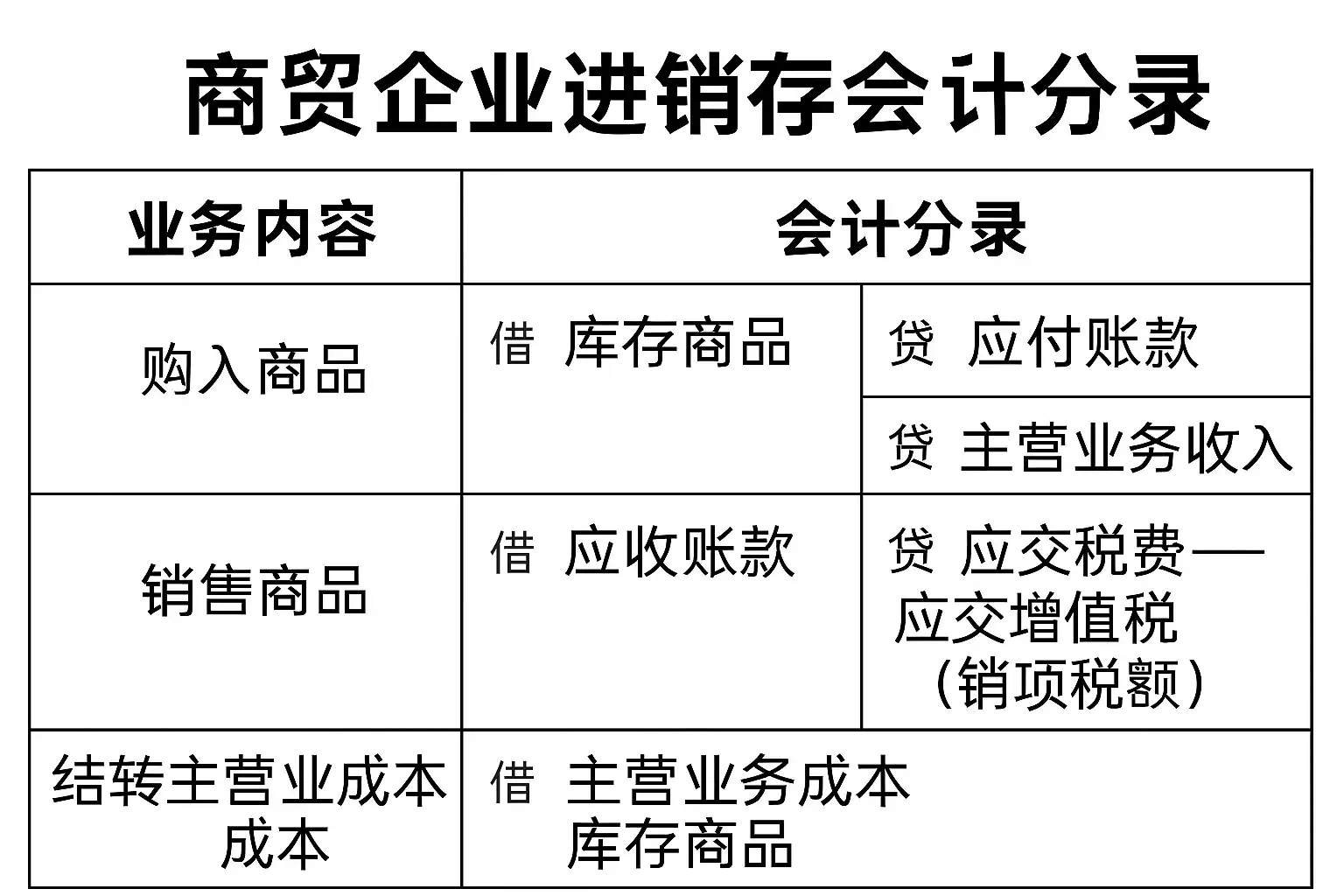| 环节 | 会计科目 | 分录示例 ||-------|----------|----------|| 采购入库 | 库存商品/应付账款 | 借:库存商品(含税价)贷:应付账款 || 销售出库 | 主营业务收入/库存商品/主营业务成本 | 借:应收账款;贷:主营业务收入;借:主营业务成本;贷:库存商品 |