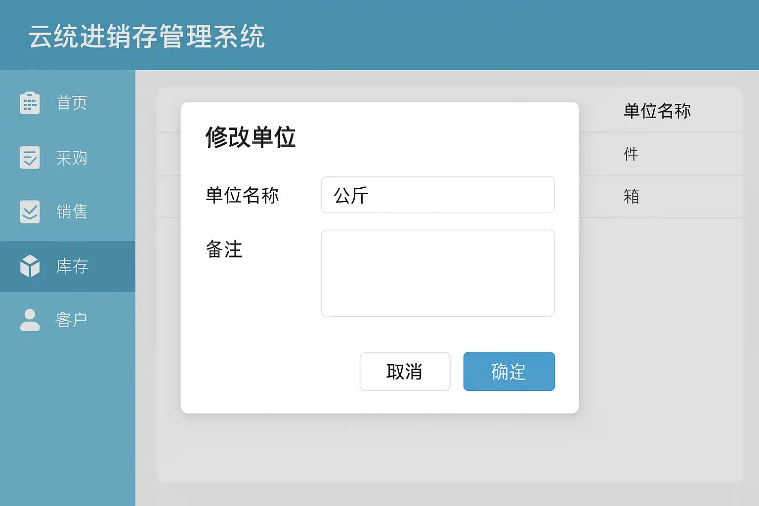 在云统进销存管理系统中修改计量单位为公斤,通常需要进入“系统设置”或“基础资料”模块,找到“计量单位管理”选项。具体步骤如下: