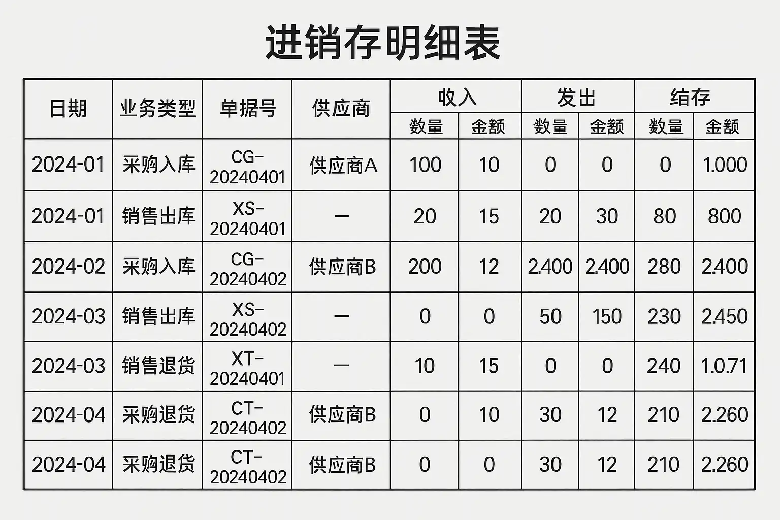 标准的进销存明细表应包含以下核心字段: