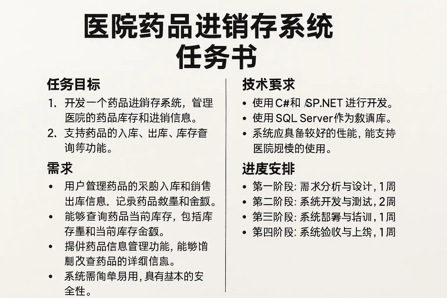 我刚接手医院药品进销存系统的项目,发现任务书写得不够清晰。想了解一个完善的任务书应该包含哪些核心内容,才能确保后续开发和管理顺利进行?