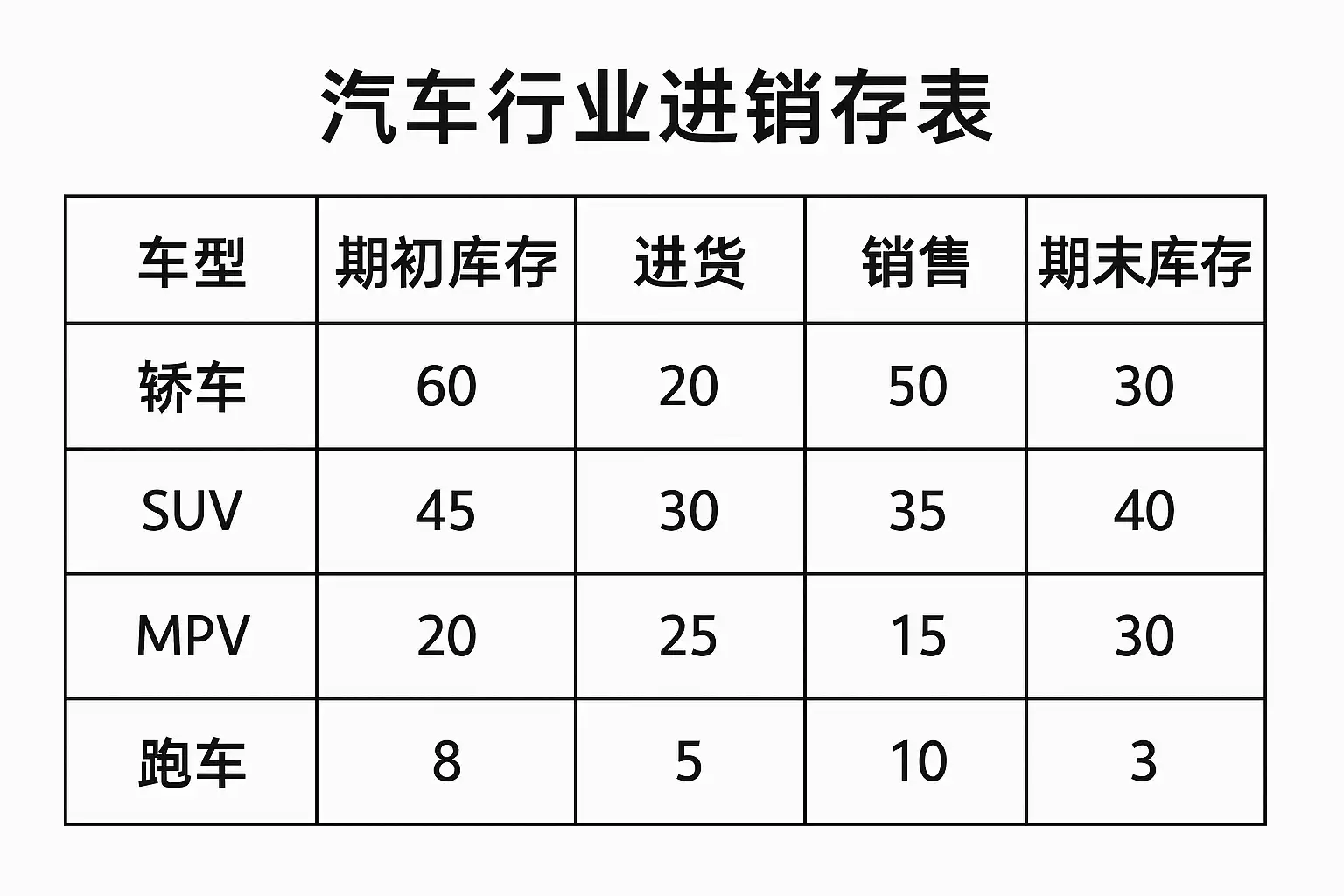 - 安全库存(Safety Stock):为防止断货而保持的最低库存量。例如,一家经销商设定安全库存为30辆SUV,以应对突发需求波动。