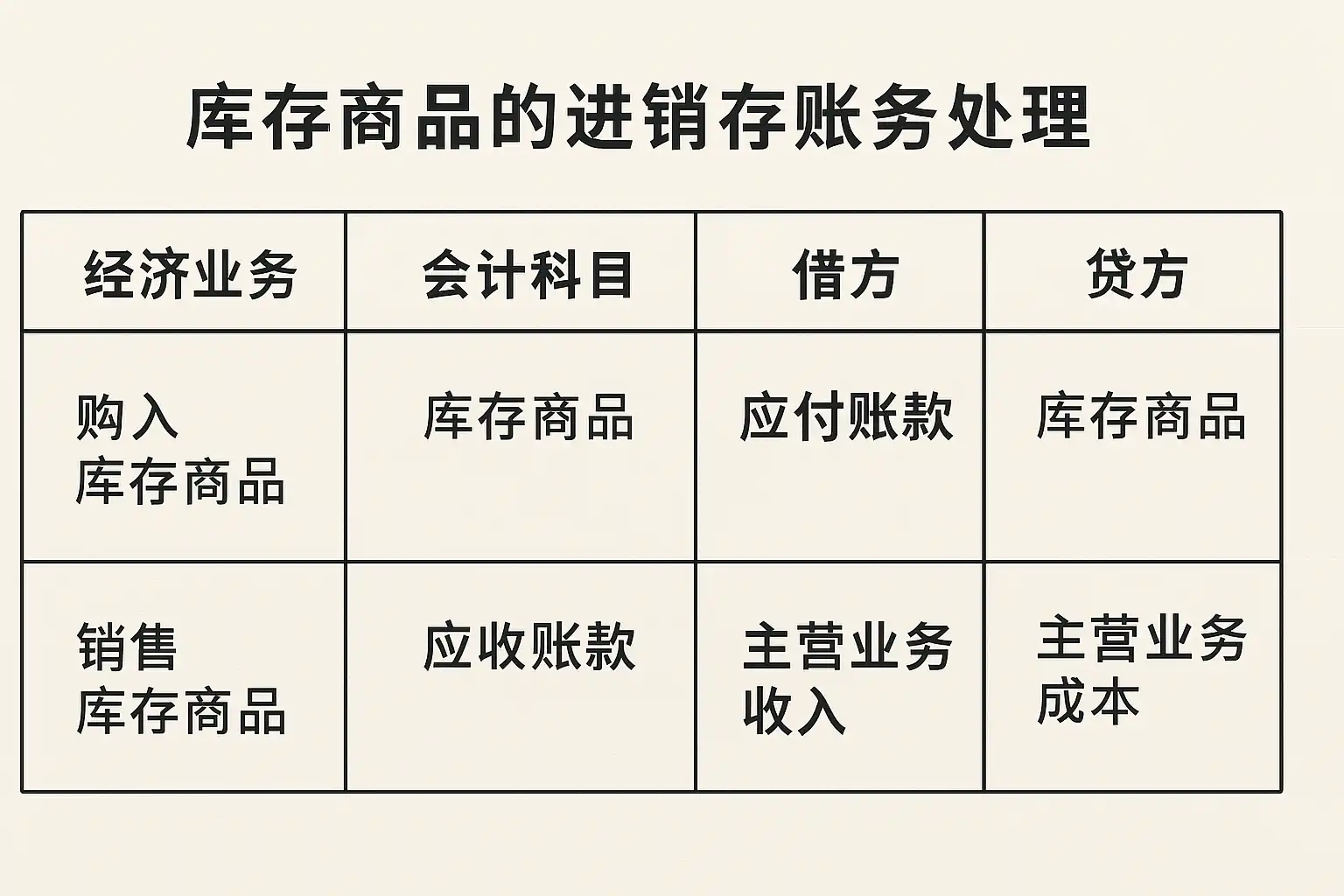 | 1. 验收入库 | 借:库存商品 | 按实际采购价计算入库金额 |