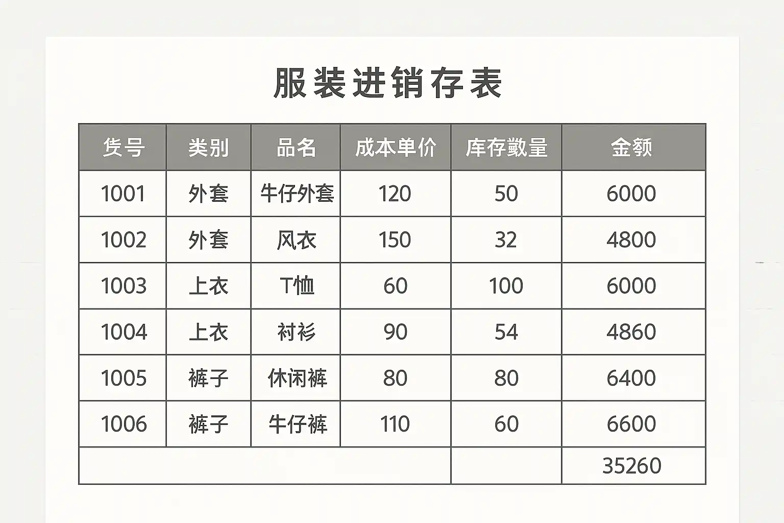 一般情况下,一个标准的服装进销存表应包含如下字段: