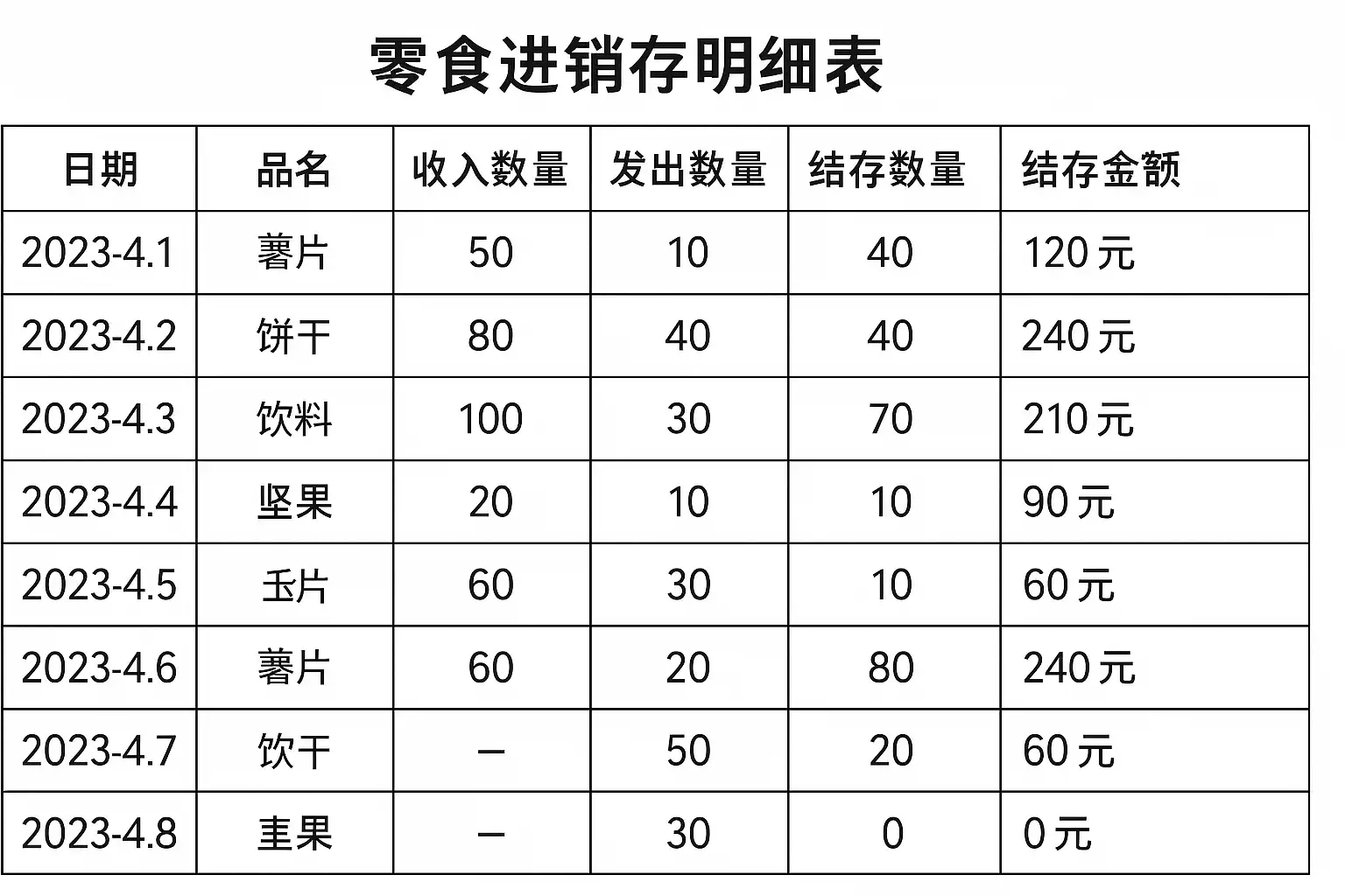 - 明确这些字段,有助于精确记录每项零食品的流转情况,实现对库存动态的全面把控。