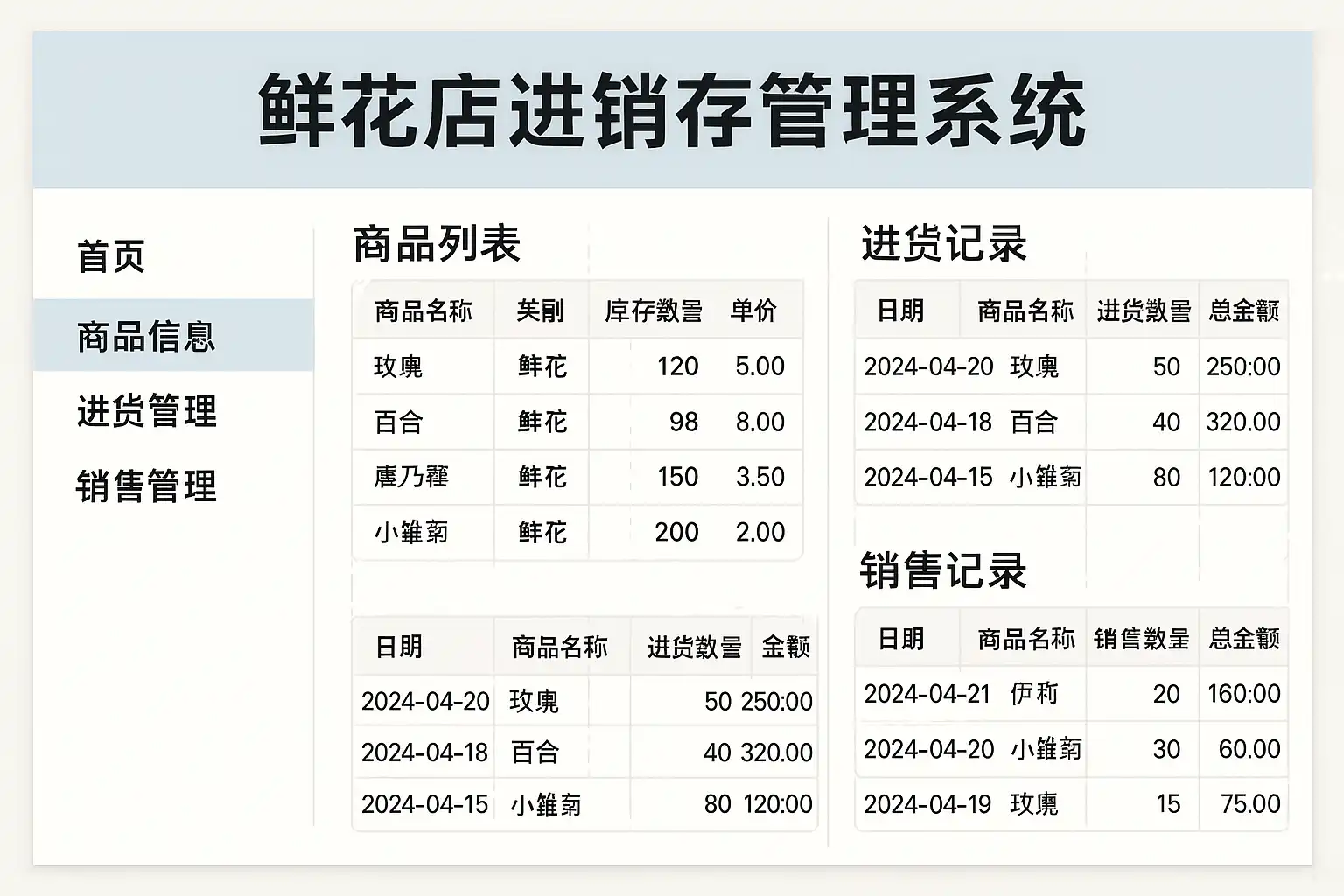 - 库存管理:实时监控鲜花类别、数量及保质期,避免断货或过期浪费。