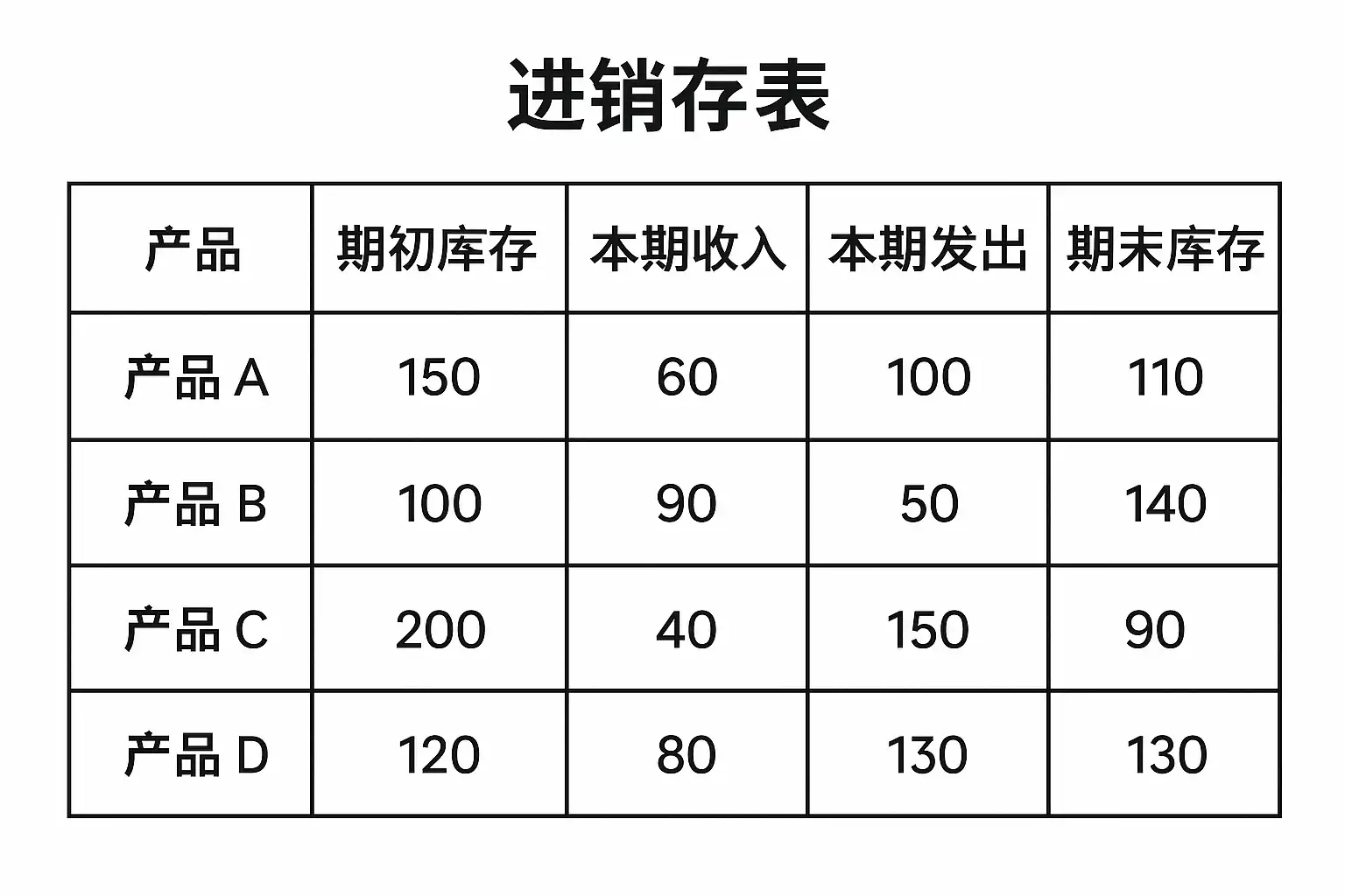 多产品的进销存表涉及多个维度的信息,需要科学布局各个字段。下面是一个典型结构示例: