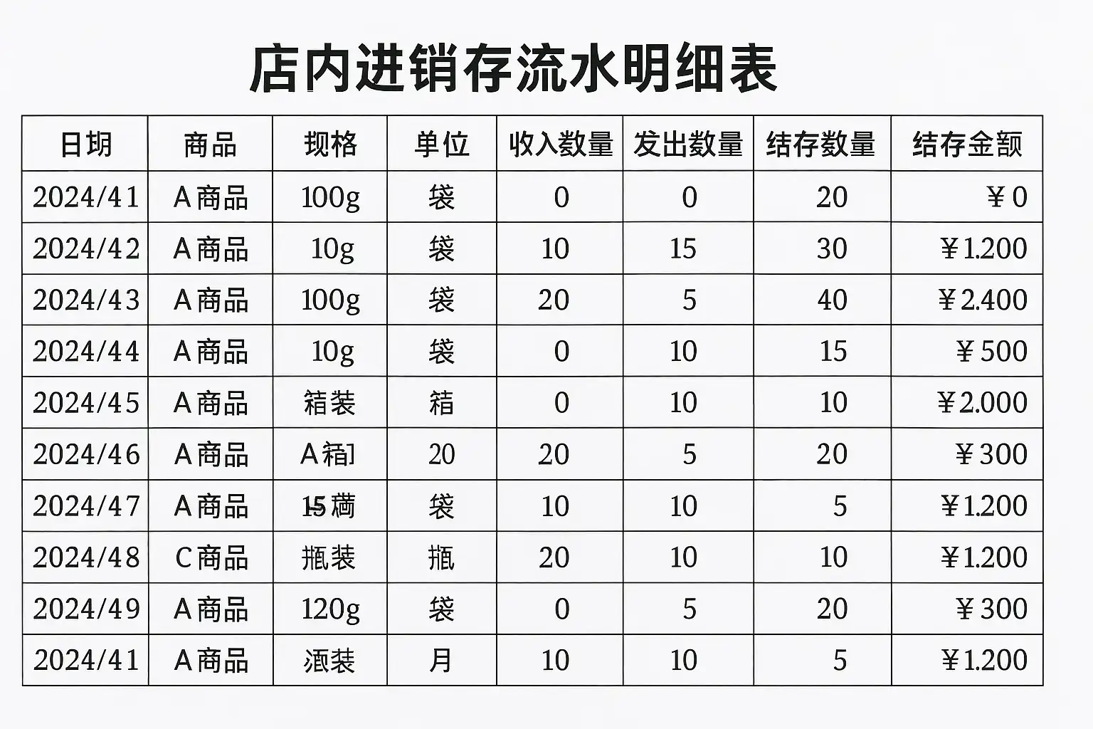 - 确定表格结构:常见字段包括日期、商品名称、规格、单价、数量、金额、小计、库存数量等。