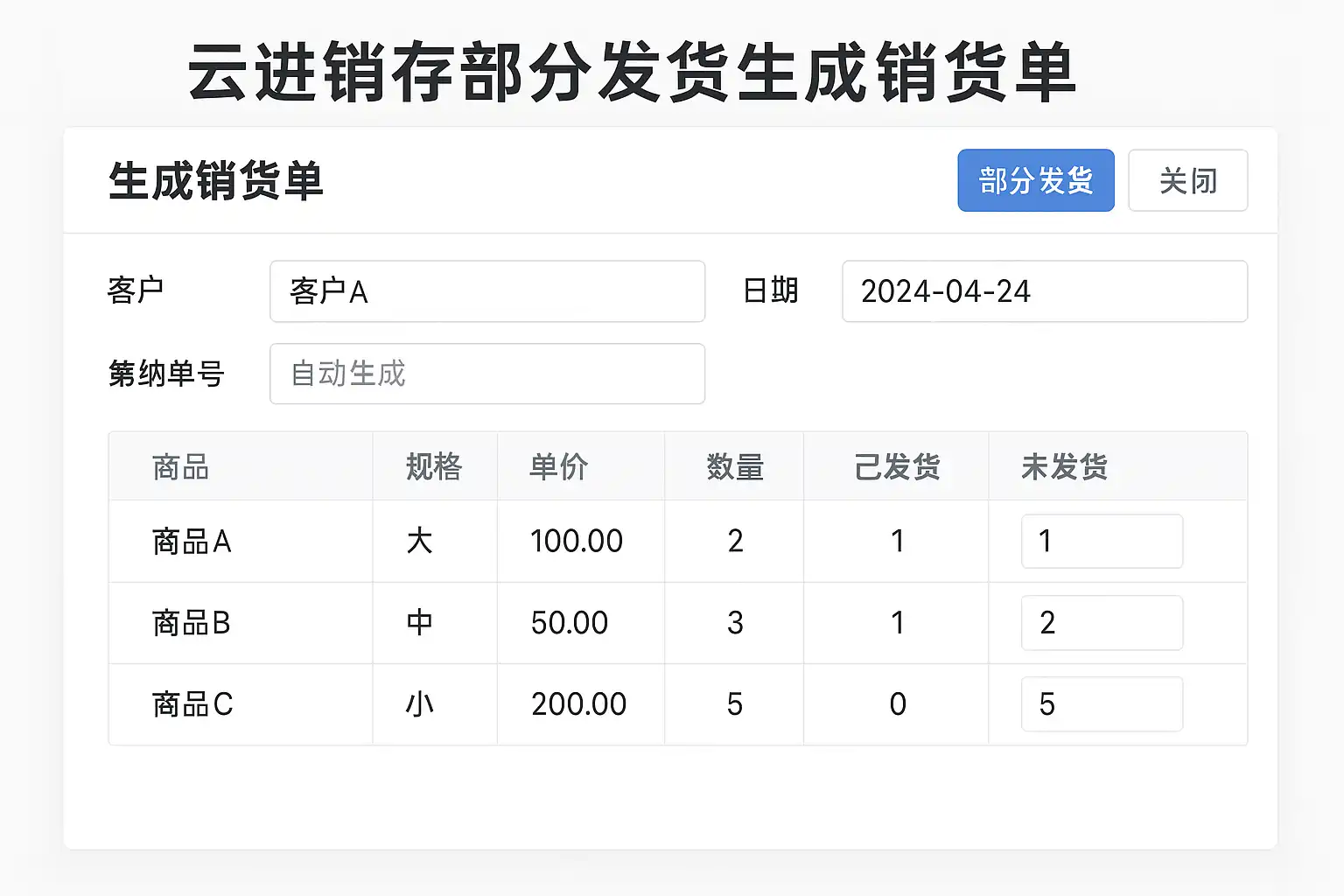 - 生成部分销货单:系统根据输入的发货数量自动生成对应的销货单,记录本次部分出库。