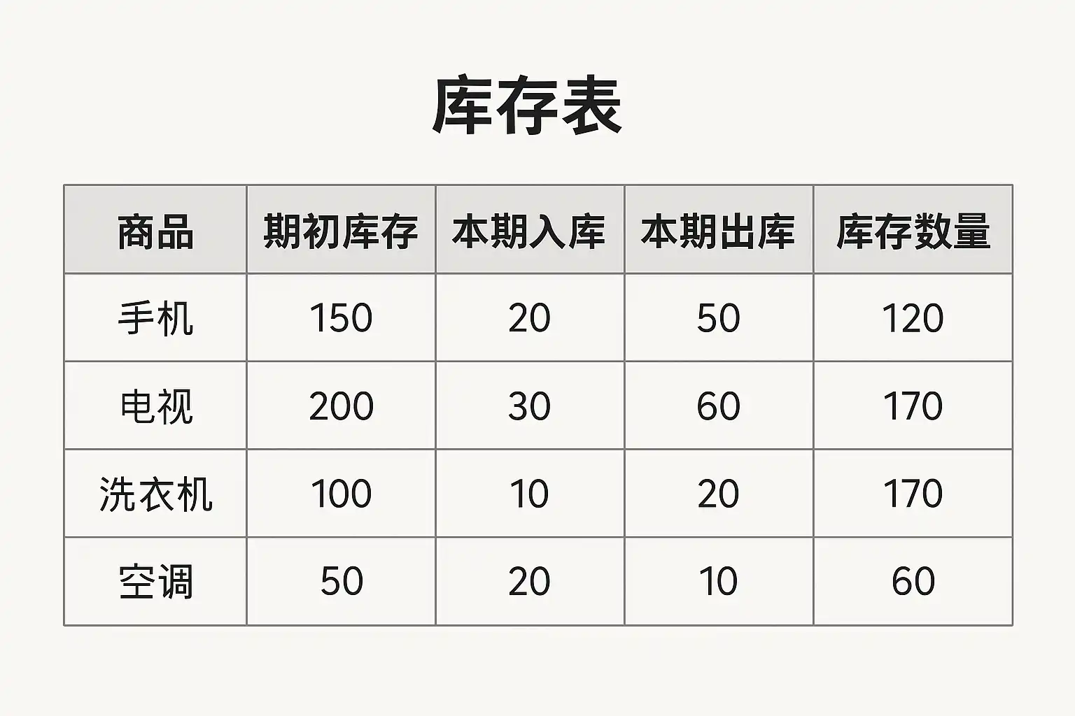 | 5. 库存运算 | 用公式统计期初+入库-出库=当前库存 |