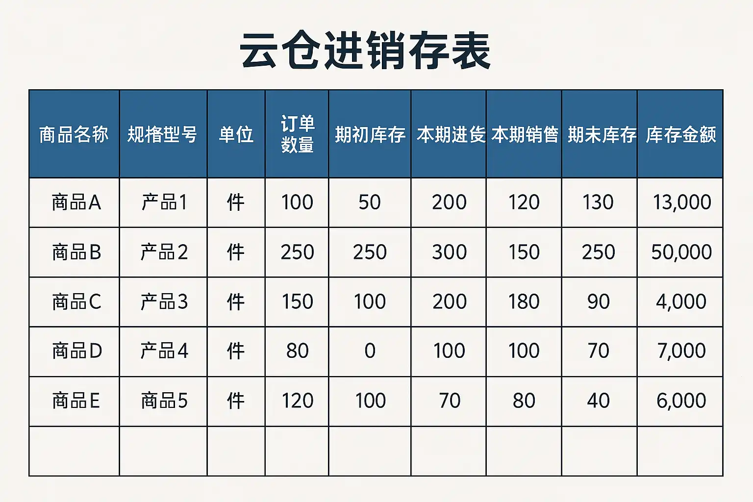在制作云仓进销存表时,需重点关注以下关键技术指标: