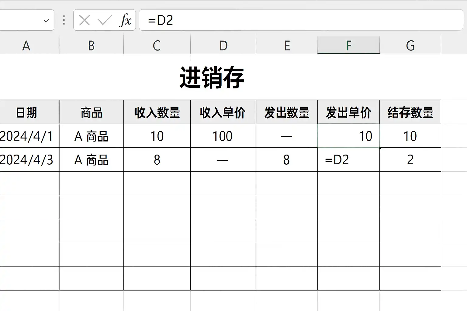 | 日期 | 类型 | 产品名 | 入库数 | 入库单价 | 出库数 | 库存结余量(G) | 库存结余金额(H) | 均价(I) ||--------|-------|---------|---------|-----------|---------|------------------|----------------------|----------------||1/1 |采购 |A |100 |10 |- |=100 |=1000 |=10 ||1/5 |采购 |A |50 |12 |- |=150 |=1600 (1000+50*12) |=10.67 ||1/7 |销售 |A |- |- 60 |=90 (150-60) |=960 (1600-60*10.67) |=10.67 |