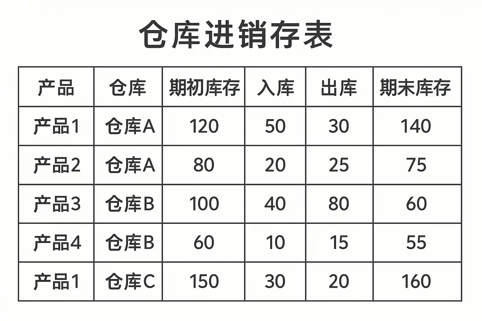 | 2024-07-01 | B | P001 | 螺丝刀 | 50 | 10 | A→B | 40 |