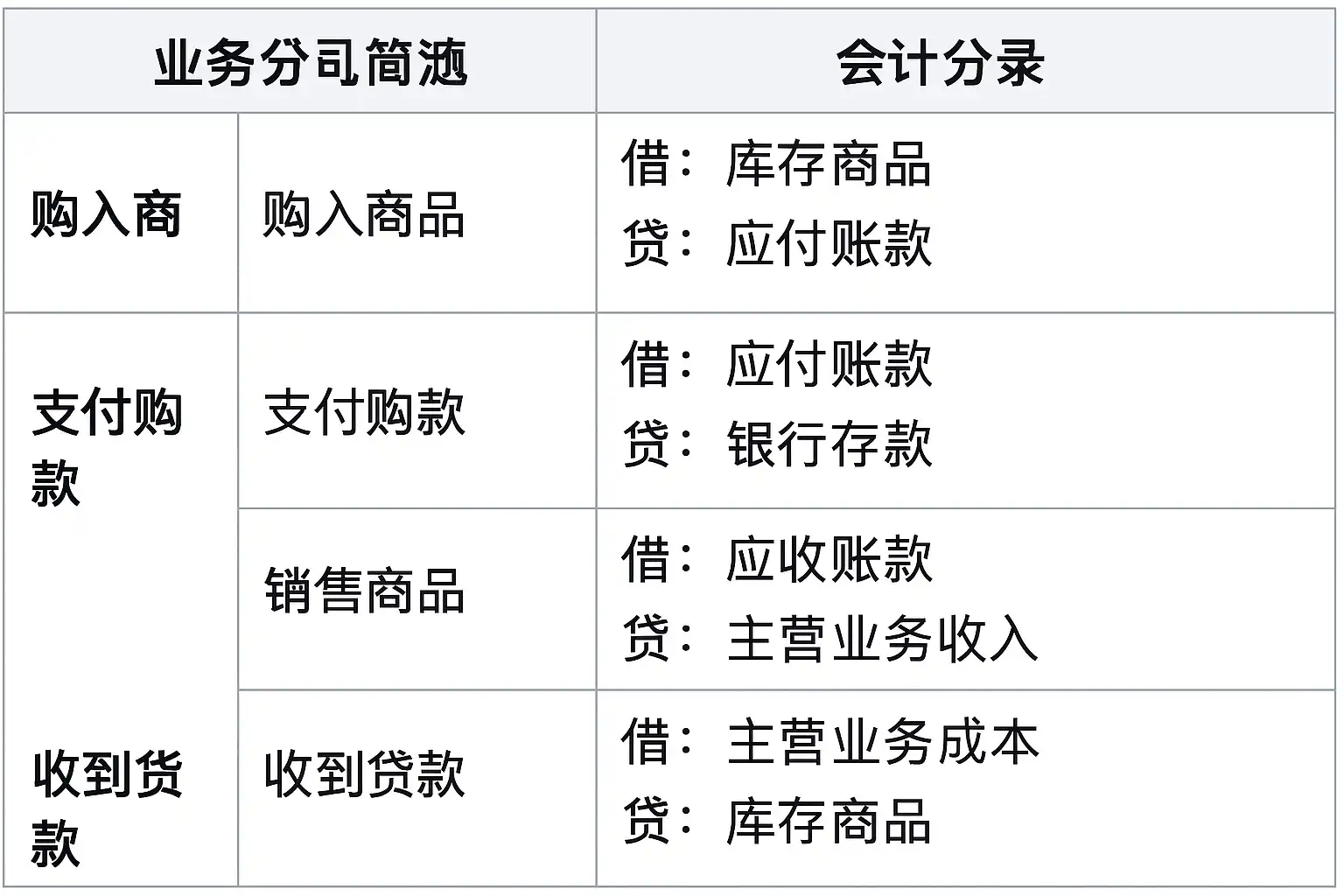 - 采购入库:借记“库存商品”,贷记“应付账款”或“银行存款”。