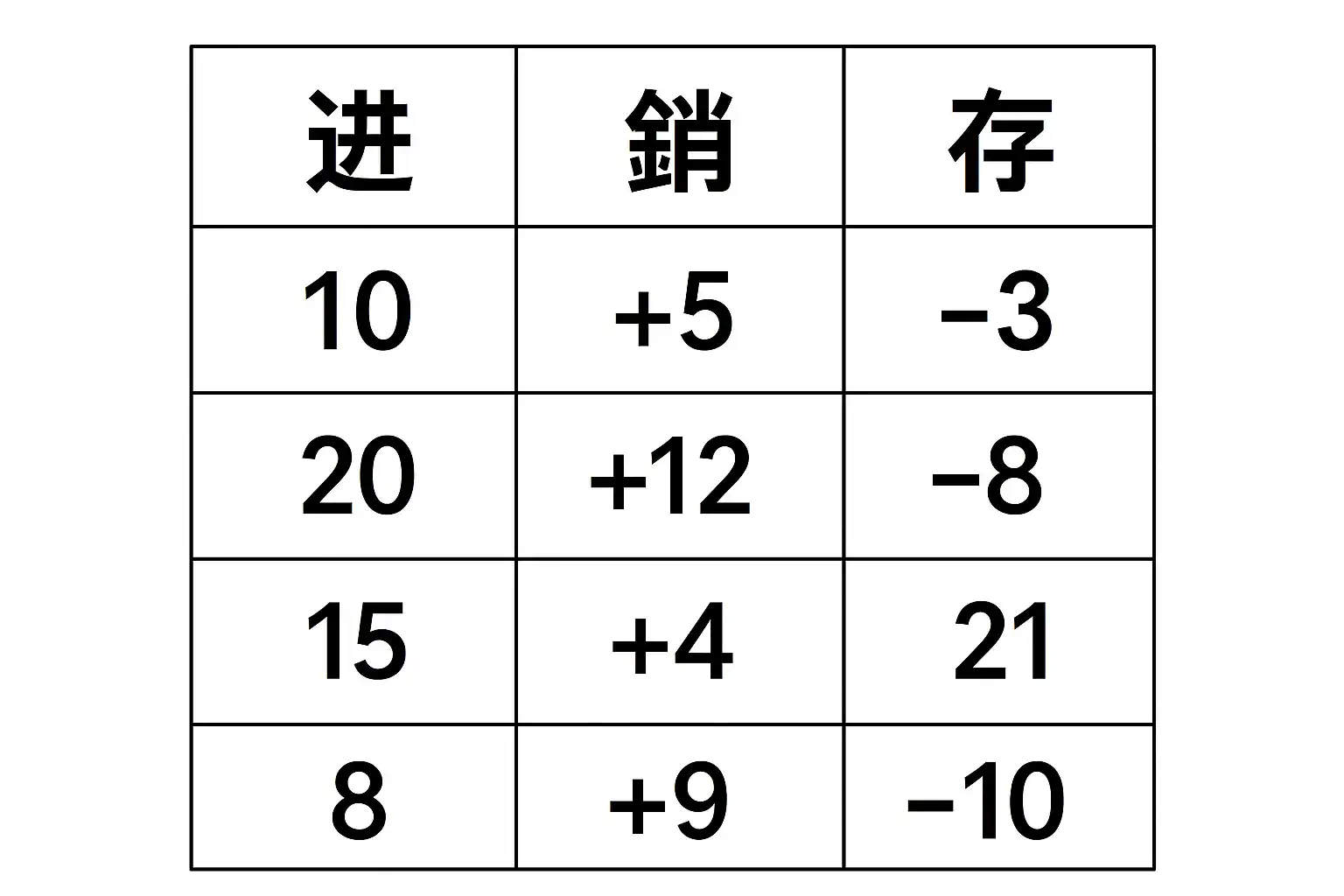 上表中,“+50”为当日收货,“-20”“-10”为两次销售,“=20”为最终剩余库存。