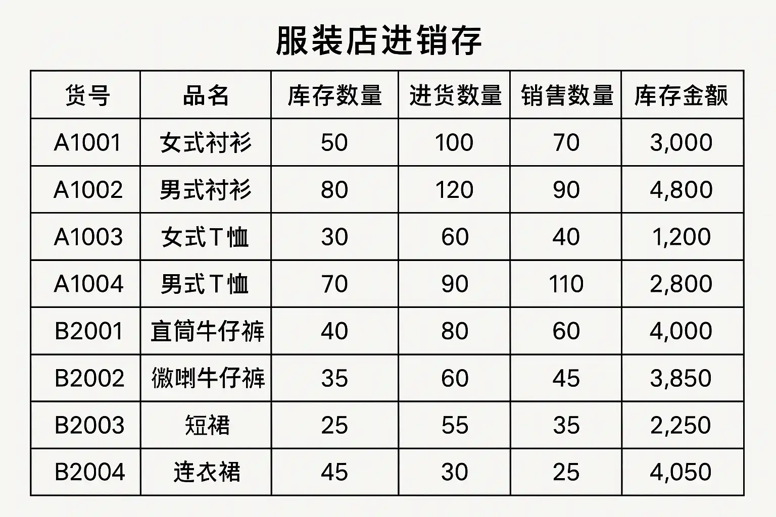 二、服装店常用进销存表格结构详解