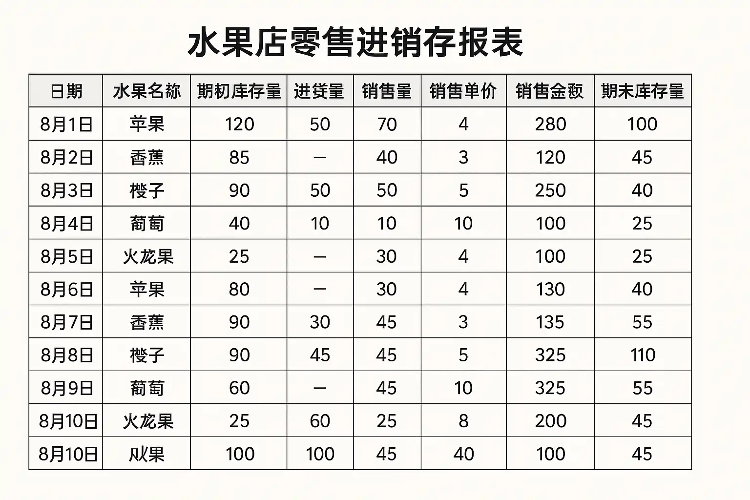 水果店零售进销存报表主要包括进货量、销售量、库存量三大核心数据,结合时间维度进行记录。常见结构如下: