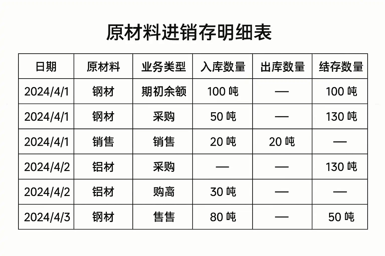 在生产制造型企业中,原材料占据着成本结构的重要部分。建立科学合理的进销存明细表,不仅能够反映出每一种原材料的实时库存情况,还能帮助企业及时发现采购与使用过程中的异常,从而优化采购计划和生产排程。以下是常见应用场景: