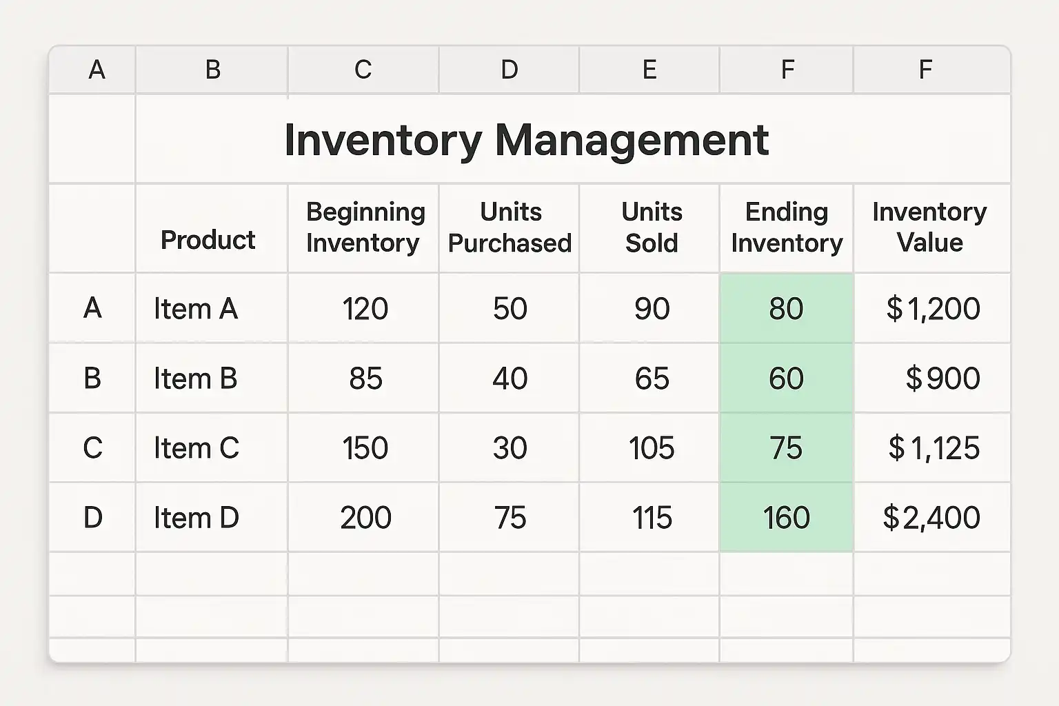 - 用公式“当前库存=初始库存+采购总量-销售总量”实时计算。