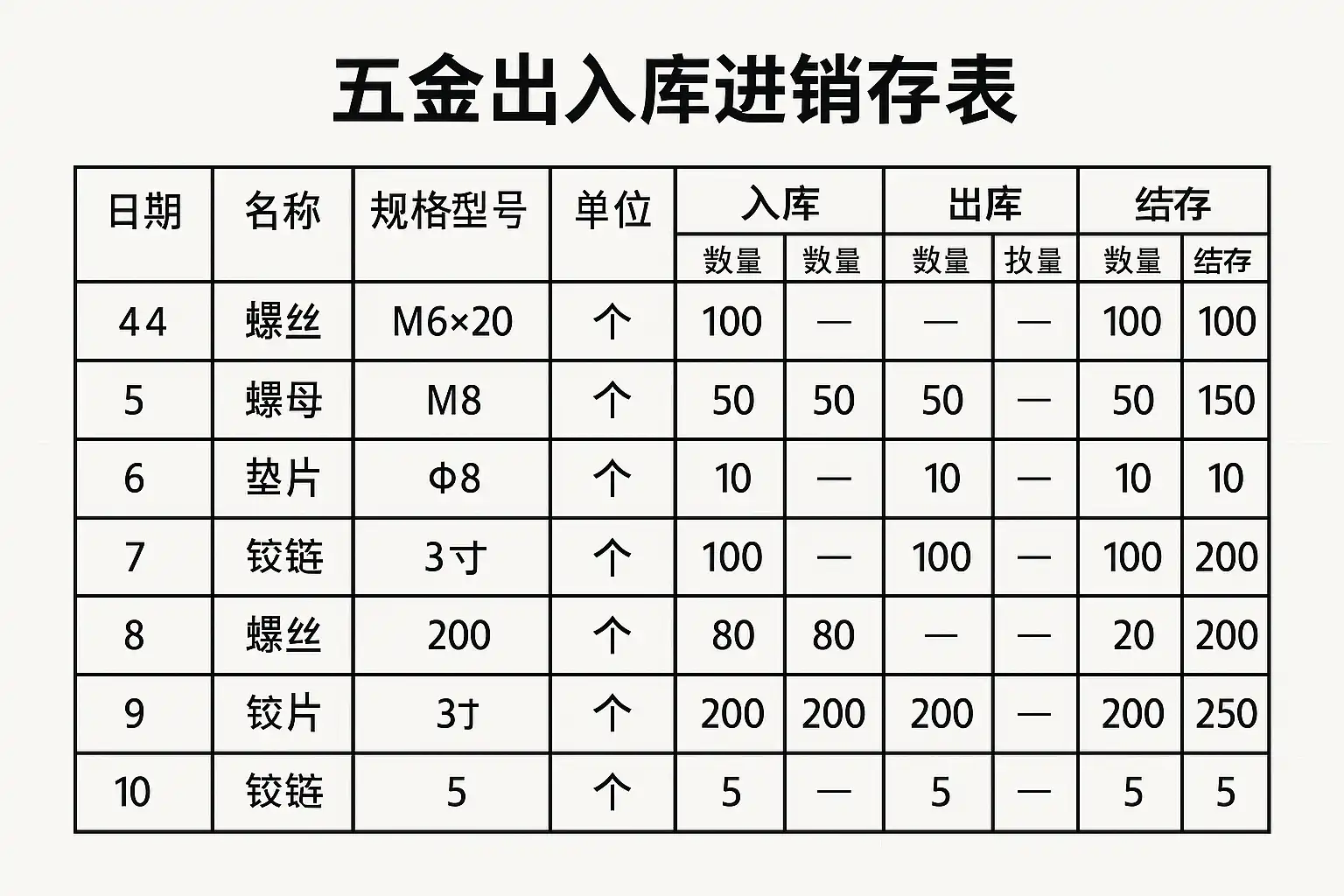 这些字段共同组成了一个标准的五金进销存台账,便于后续的数据统计与分析。